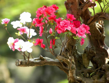 夏鹃:原产印度和日本,日本称为皋月杜鹃。发枝在先,开花最晚,一般在5月下旬至6月,故名。主要特征是枝叶纤细,分枝稠密,树冠丰满、整齐,高1米左右。叶片狭小,排列紧密。花宽漏斗状,径6-8厘米,花色、花瓣同西鹃一样丰富多变,花有单瓣、复瓣、 重辨,是制作桩景的好材料。传统品种有'长华'、'大红袍'、'陈家银红'、'五宝绿珠'、'紫辰殿' 等。其中'五宝绿珠'花中有一小花,呈台阁状,是杜鹃花中重瓣程度最高的一种。